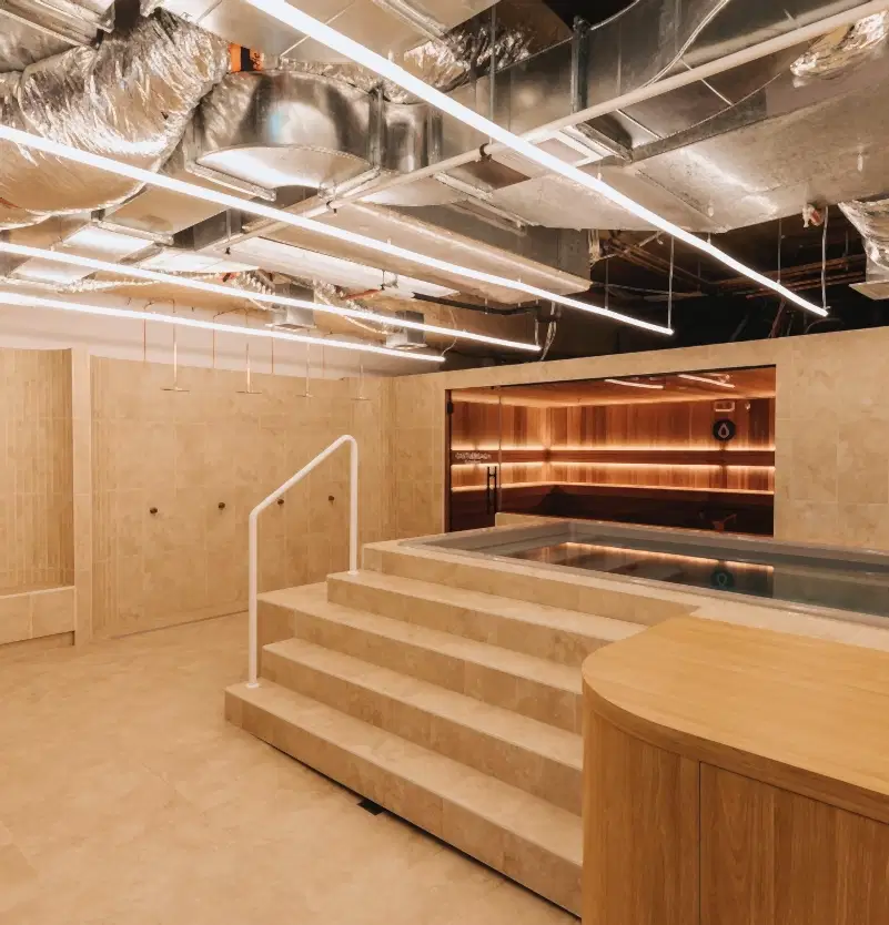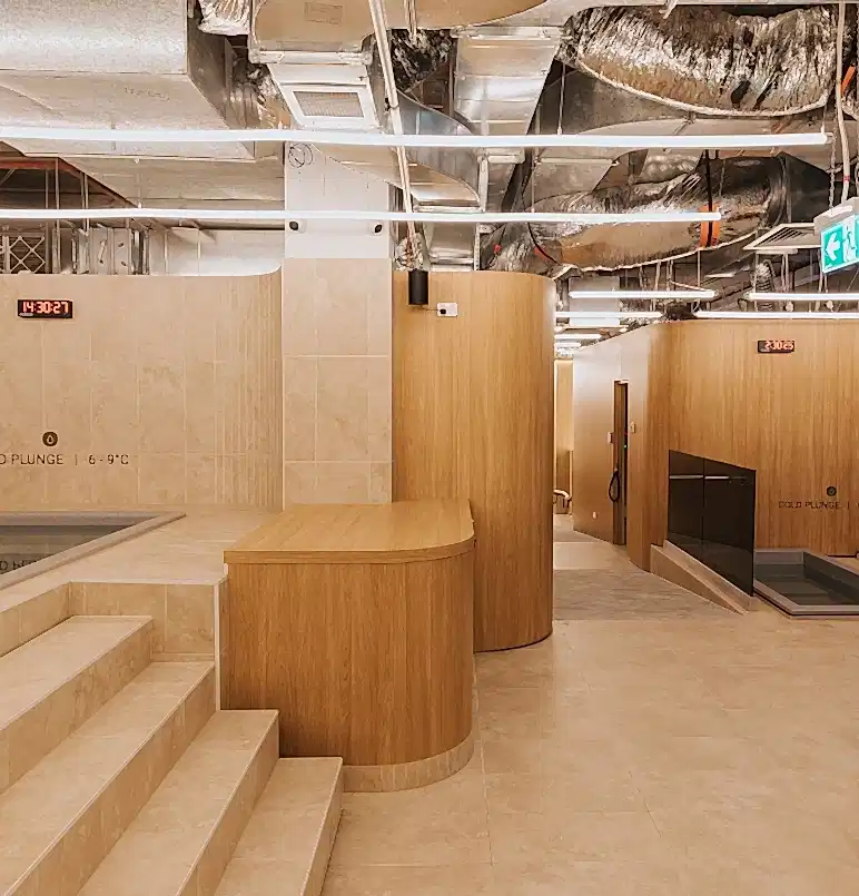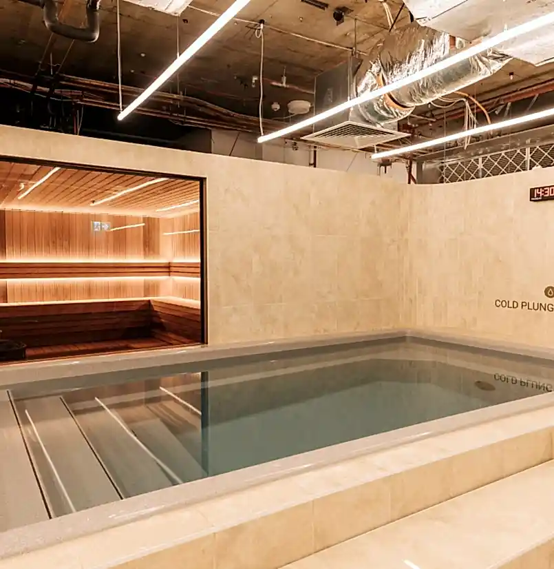 Our standard lightweight free-standing plunge and recovery pools come “nude”, with the composite exoskeleton engineered to support a cantilever deck for ease of building around the pool – this means you can seamlessly integrate this into your studio construction and aesthetic. Or if you wish, you can choose one of our optional finishes (below).